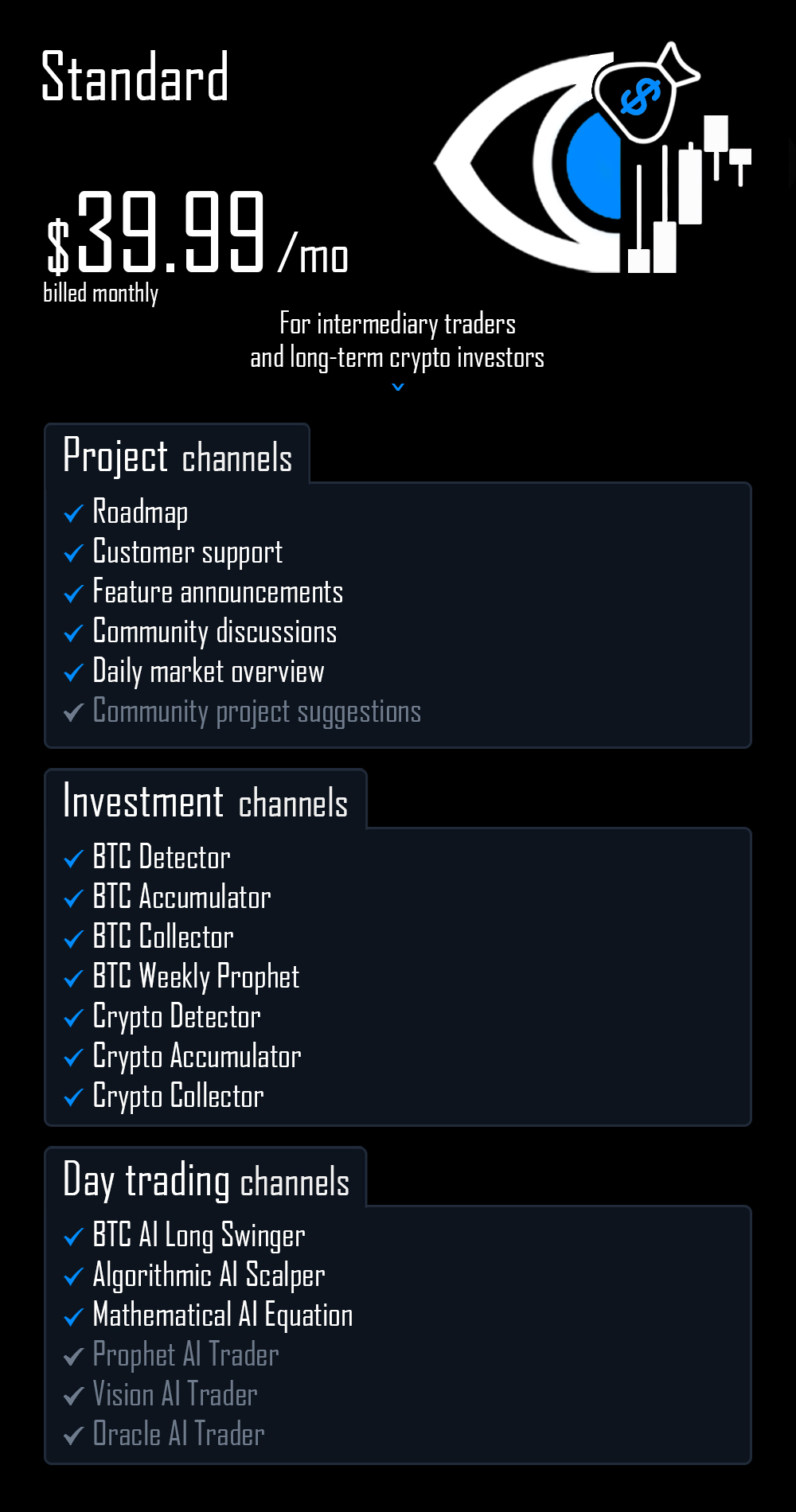 Choose the plan that fits your trading journey. Whether you’re just starting out or aiming for advanced strategies, our flexible tiers give you access to AI-powered signals, expert tools, and community support — all designed to maximize your success.